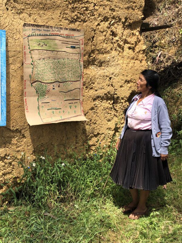 Je m’appelle Julia. Je suis agricultrice dans la région de Huánuco au Pérou. J’ai cinq enfants et suis veuve. Mes enfants sont tous partis vivre et travailler à la ville, alors je me retrouve seule. Dans le cadre du programme que je suis avec IDMA, [un partenaire de l’ONG Iles de Paix, dont le programme est soutenu par l’Opération 11.11.11], j’ai dessiné la ferme de mes rêves, et donc les objectifs que j’aimerais atteindre. Et je m’y tiendrai tant que je pourrai le faire physiquement.