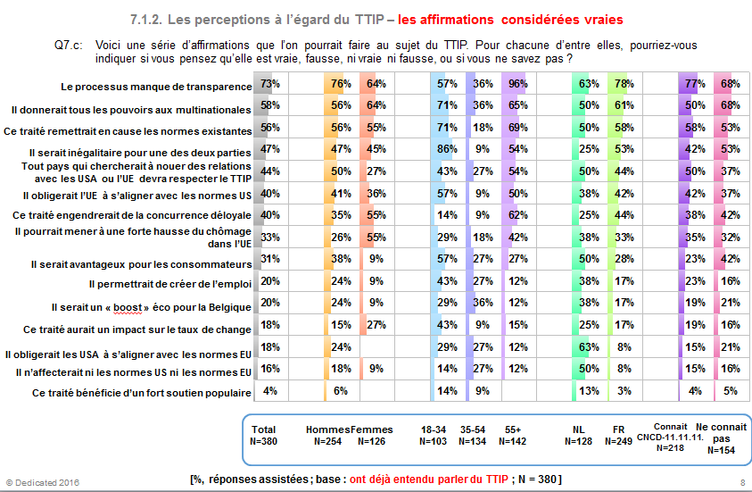 Un sondage n’a pas valeur de vérité révélée. Mais force est de constater que la population belge partage largement les préoccupations mises en avant par le CNCD-11.11.11 et une large part de la société civile. Parmi les Belges qui ont entendu parler du traité transatlantique de commerce et d’investissement (TTIP), une large majorité considère qu’il « donnerait tout le pouvoir aux multinationales » (58%) ou qu’il « remettrait en cause les normes existantes » (56%), selon un sondage Dedicated Research commandité par le CNCD-11.11.11. Ces résultats confirment le faible soutien du public belge pour ce projet de traité. Près de trois quarts de la population (73%) pense que le processus global de négociation « manque de transparence ».