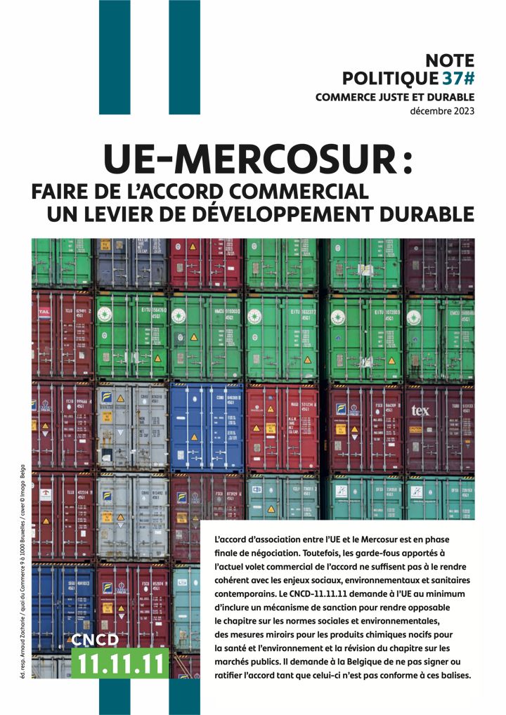 L’accord d’association entre l’UE et le Mercosur est en phase finale de négociation. Toutefois, les garde-fous apportés à l’actuel volet commercial de l’accord ne suffisent pas à le rendre cohérent avec les enjeux sociaux, environnementaux et sanitaires contemporains. Le CNCD-11.11.11 demande à l’UE au minimum d’inclure un mécanisme de sanction pour rendre opposable le chapitre sur les normes sociales et environnementales, des mesures miroirs pour les produits chimiques nocifs pour la santé et l’environnement et la révision du chapitre sur les marchés publics. Il demande à la Belgique de ne pas signer ou ratifier l’accord tant que celui-ci n’est pas conforme à ces balises.