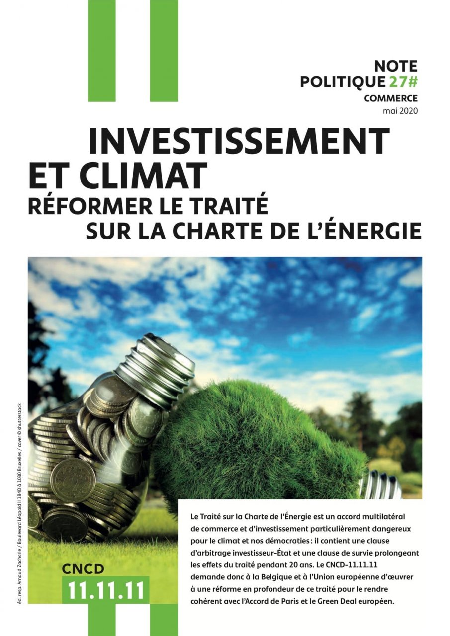 Investissement & climatLe Traité sur la Charte de l’Énergie est un accord multilatéral de commerce et d’investissement particulièrement dangereux pour le climat et nos démocraties : il contient une clause d’arbitrage investisseur-État et une clause de survie prolongeant les effets du traité pendant 20 ans. Le CNCD-11.11.11 demande donc à la Belgique et à l’Union européenne d’œuvrer à une réforme en profondeur de ce traité pour le rendre cohérent avec l’Accord de Paris et le Green Deal européen.